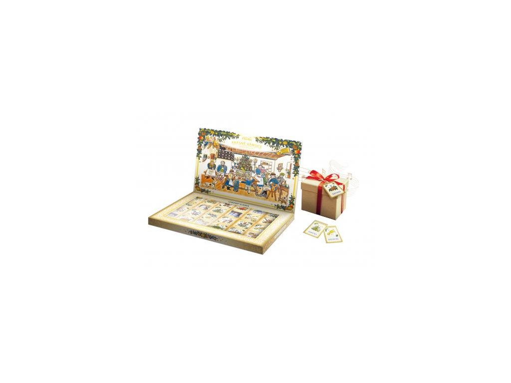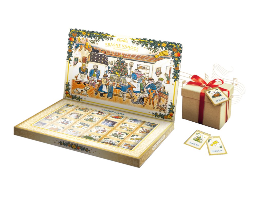 24 mléčných čokoládek. Balení obsahuje jmenovky na vánoční dárky a také noty se slovy nejkrásnější české koledy.Nutriční hodnoty