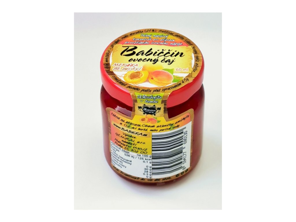 Babiččin ovocný čaj je vynikající nápojový koncentrát s kousky ovoce bez jakýchkoliv konzervačních látek či barviv. Je slazen pouze fruktozou a proto je vhodný pro malé děti i pro diabetiky.Nutriční hodnoty