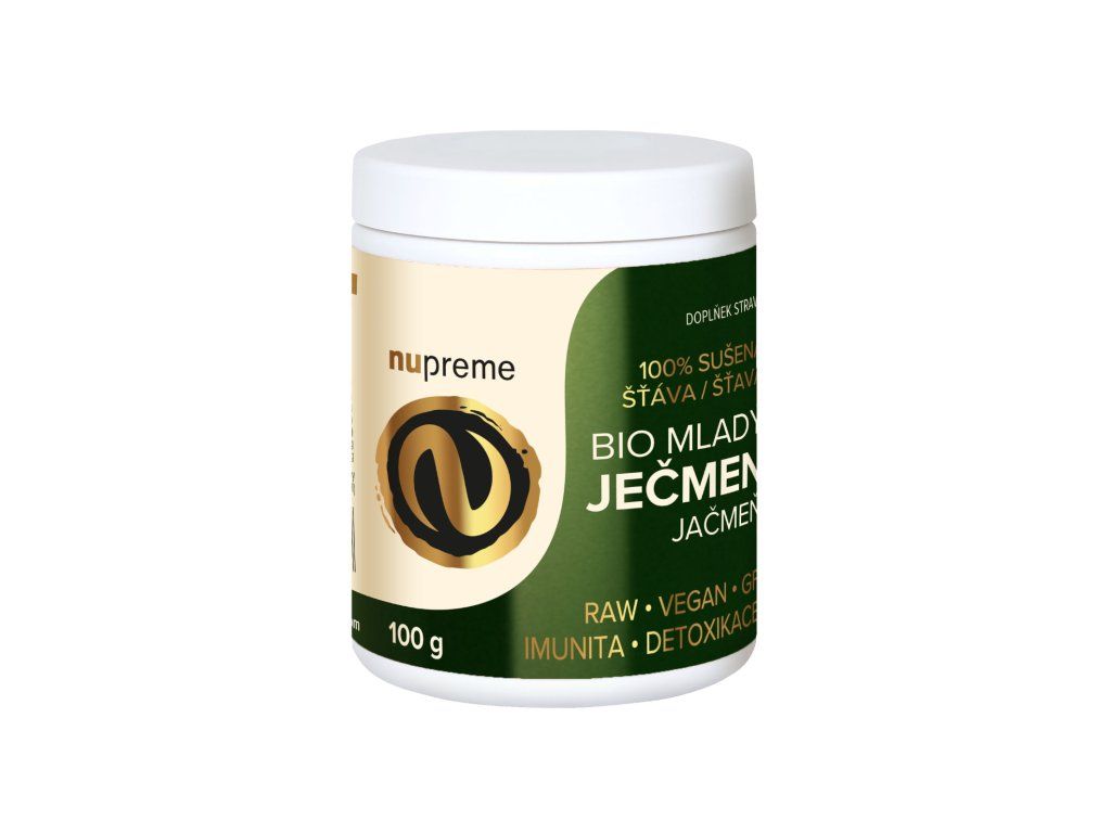 Určitě jste se již setkali s mladým ječmenem a zeleným ječmenem. Mladý ječmen je označení pro šťávu z výhonků mladých rostlinek, kdežto zelený ječmen tvoří jeho sušené výhonky. Šťáva je nabitá antioxidanty a vitaminy, které pomáhají snižovat překyselení našeho organismu a zvyšovat jeho obranyschopnost. Mladý ječmen BIO NUPREME se navíc může pyšnit RAW zpracováním za nízkých teplot, tudíž si udržuje i po usušení vysoký podíl aktivních složek. Neužívejte ječmen, když... máte problémy s žilním systémem, případně užíváte léky na ředění krve (např. Warfarin). Nedoporučujeme mladý ječmen užívat také v případě, že berete léky na potlačení imunity, například po transplatanci orgánů. Zpočátku můžete pozorovat lehkou bolest hlavy nebo průjem, tělo se takto čistí a reaguje na silný antioxidant. Pokud máte jakékoli pochybnosti, navštivte svého lékaře. Dávkování: Dospělí – 1 zarovnaná čajová lžička (cca 1,5 g) 2 x denně na lačno, děti od 3 let – 1/2 čajové lžičky (cca 0,75 g) 1 x denněNutriční hodnoty