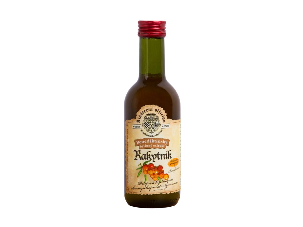 Benediktinský bylinný extrakt z rakytníku řešetlákového (Hippophae rhamnoides) ve formě sirupu podporuje správnou funkci imunitního systému. Rakytník má pozitivní vliv na zdraví srdce a přispívá k dobrému stavu pleti. Extrakt obohacen o vitamín C.Nutriční hodnoty