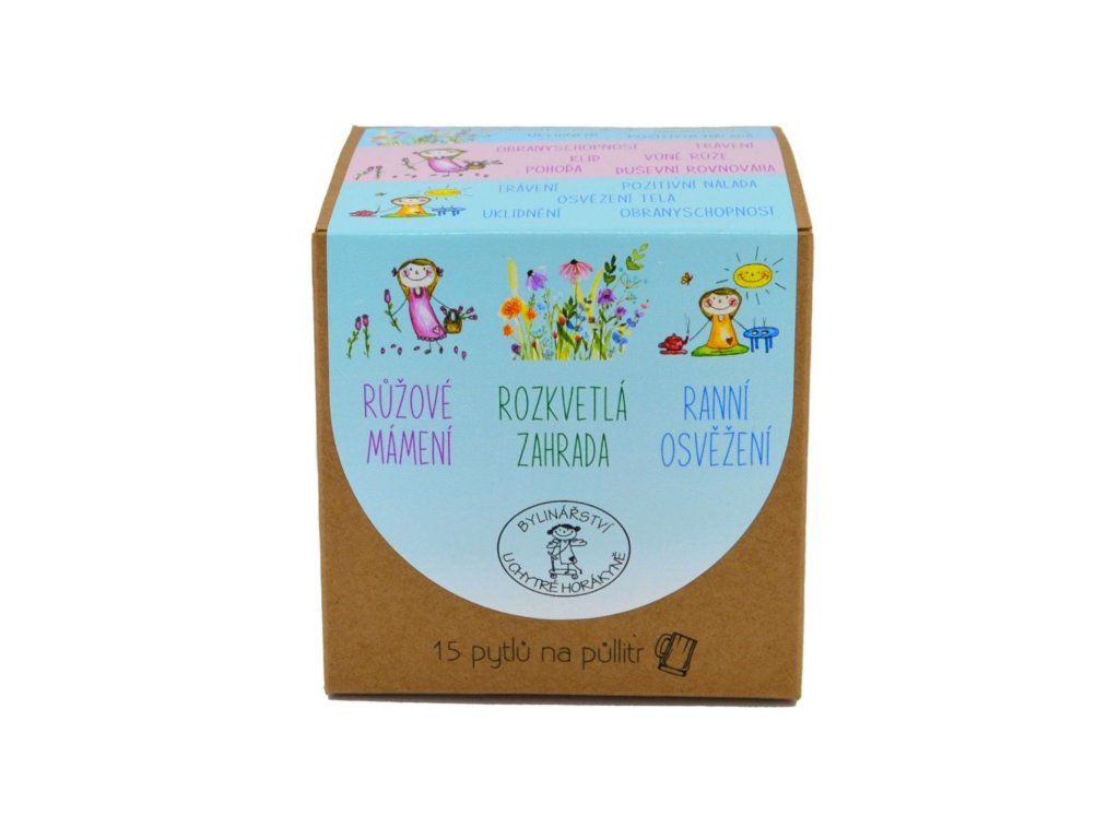 Variace porcovaných bylinkových čajů Růžové mámení, Rozkvetlá zahrada a Ranní osvěžení. Nejsem žádné ořezávátko. Mám v sobě velké čajové pytlíky na půllitr, ať si dáš pořádný kotlík čaje. Jo a krabičku mám z recyklovaného papíru. Návod na to, jak mě máš připravit: Hoď mě do velkého hrnku, zalij mě půllitrem vody a nechej mě koupat 10 min. Pak mě vytáhni a vychutnej si výborný čaj.Nutriční hodnoty
