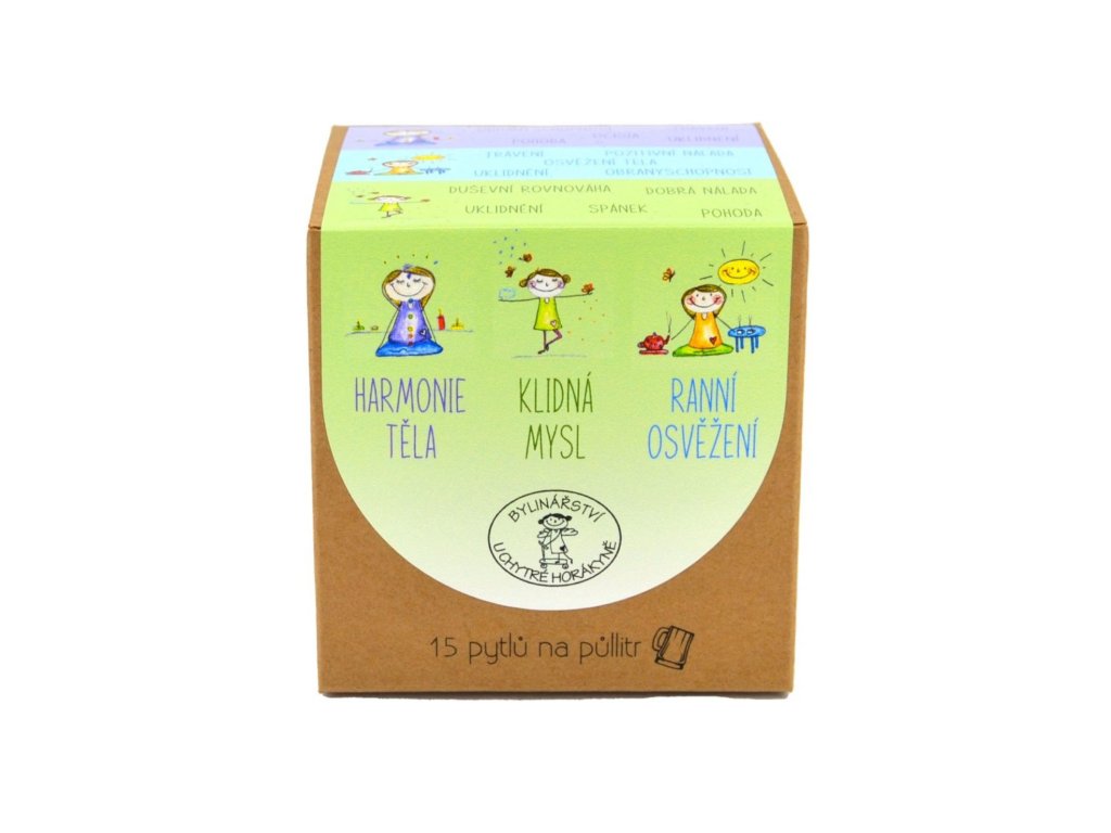 Variace porcovaných bylinkových čajů Harmonie těla, Klidná mysl a Ranní osvěžení. Nejsem žádné ořezávátko. Mám v sobě velké čajové pytlíky na půllitr, ať si dáš pořádný kotlík čaje. Jo a krabičku mám z recyklovaného papíru. Návod na to, jak mě máš připravit: Hoď mě do velkého hrnku, zalij mě půllitrem vody a nechej mě koupat 10 min. Pak mě vytáhni a vychutnej si výborný čaj.Nutriční hodnoty