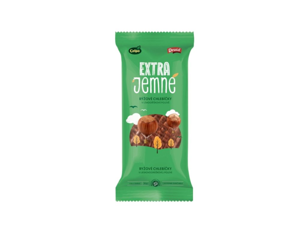Extra jemné rýžové chlebíčky v lískooříškové polevě. Lehké, křupavé a zalité lahodnou lískooříškovou polevou! Extra jemné rýžové chlebíčky Druid v sobě spojují jemnost rýžového základu a bohatou chuť oříšků, díky které jsou ideální sladkou svačinou pro každý den. Lískooříšková poleva jim dodává sametově sladký nádech, který si zamilují malí i velcí. A to vše bez lepku a nově s ještě větší vrstvou polevy! Chlebíčky jsou přirozeně bezlepkové, balené po 6 kusech a perfektní jako rychlé mlsání doma, do práce i na cesty. Sladká radost bez zbytečné zátěže.Nutriční hodnoty