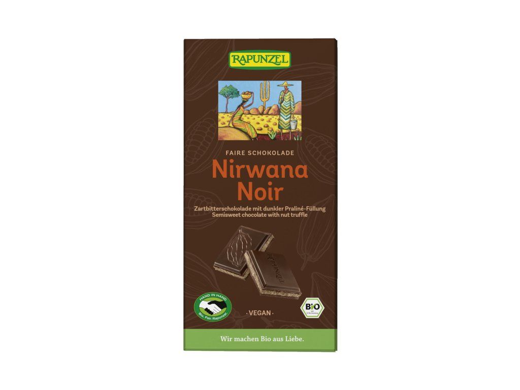 Nirwana Noir - klenot mezi hořkými čokoládami. Jemně se rozplývající a krémová s jemnou tmavou pralinkovou náplní. Čokoláda Rapunzel představuje nejvyšší kvalitu podle švýcarské výrobní tradice v kombinaci s hodnotnými fair-trade surovinami z ekologického zemědělství. Intenzivní konšování je kromě cenných surovin, skutečným tajemstvím pravého čokoládového požitku. Prostřednictvím umění konšování se původně skryté bohatství kakaových chutí postupně rozvíjí, až se plně rozvine. Zároveň vzniká dokonalá jemnost a nesrovnatelně jemná hladkost.Nutriční hodnoty