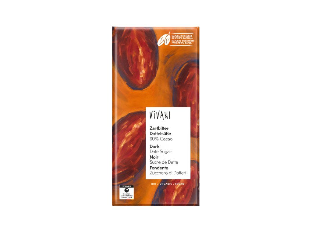 60 % kakaa. Vegan. Přírodní sladidlo ze 100 % datlí Toto sladidlo z hořké čokolády a datlí neobsahuje absolutně žádný přidaný rafinovaný cukr. Výhradní použití jemně mletých datlí dodává čokoládě přirozeně sladkou, karamelovou vůni s náznaky ovocné kyselosti. Toto sladidlo je také zcela nerafinované, takže zachovává cenné minerály, vitamíny a vlákninu. Jemné tóny kakaa (60% obsah) dokonale ladí s touto jedinečnou sladkostí.Nutriční hodnoty