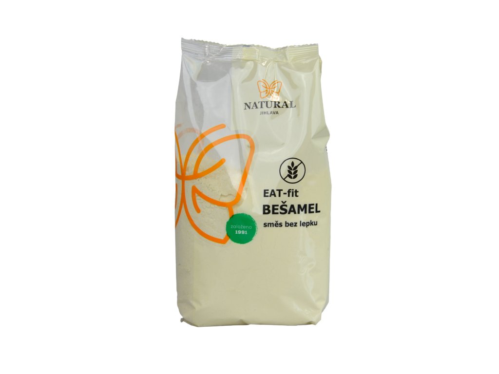 Vyrobeno podle originální receptury EAT-fit. EAT-fit BEŠAMEL v sobě snoubí přednosti tří přirozeně bezlepkových mouk a byl vyvinut speciálně pro výrobu omáček a zahušťování. S jeho pomocí snadno a bez obav připravíte zásmažku, bešamelový základ, zahustíte zelí i bramborové těsto. Jsou z něj však skvělé také palačinky, nudle nebo dortové korpusy. Recept na BEZLEPKOVÝ BEŠAMEL V hrnci rozpustíme 50 g másla a za stálého míchání přidáváme 40 g směsi. Umícháme světlou jíšku, kterou postupně ředíme 500 ml vlažného mléka a za stálého promíchávání vaříme do zhoustnutí asi 10 minut. Na závěr osolíme a přidáme nastrouhaný muškátový oříšek nebo květ a dobře promícháme. Bešamelovou omáčku používáme například do lasagní nebo musaky. V omáčce můžeme rozpustit nastrouhaný sýr a použít ji při zapékání brambor, zeleniny nebo na těstoviny. Recept na bezlepkovou KOKOSOVOU BABETU Suroviny: 1 hrnek kokosu, 2 hrnky směsi EAT-fit Bešamel, 1 prášek do pečiva (10 g), 1/2 hrnku cukru, 3/4 hrnku oleje, 3/4 hrnku mléka, 1/2 lžičky citrónové kůry, 3 vejce, špetka soli. 1 hrnek = 200 ml. Postup: Troubu si rozehřejeme na 170°C. Formu na chléb vymažeme tukem a vysypeme částí kokosu. Všechny suché ingredience suroviny smícháme v míse dohromady. Postupně k nim přidáváme celá vejce, mléko a olej a vše dobře promícháme. Hotové těsto přemístíme do připravené formy a pečeme nejprve 30 min na 170 °C a dalších 20 min na 150 °C. TIP: Můžeme přidat také pravou vanilku nebo vanilkový cukr a kokos můžeme nahradit rozemletými mandlemi. Inspiraci k pečení a vaření najdete na https://www.naturaljihlava.cz/recepty.phpNutriční hodnoty