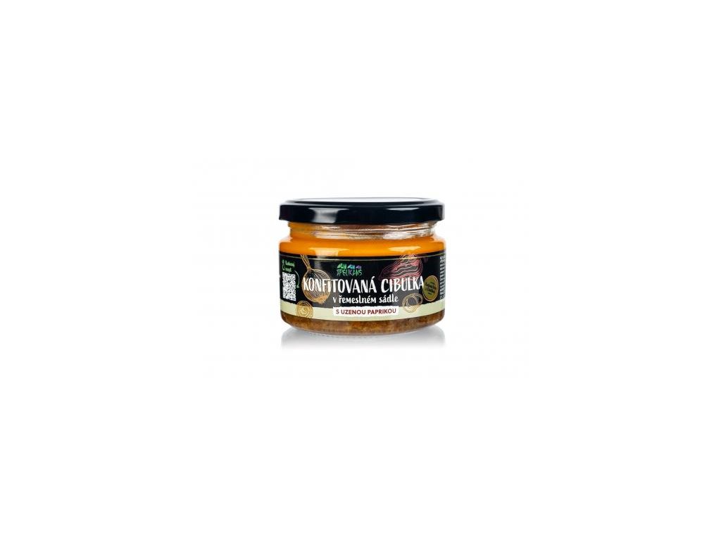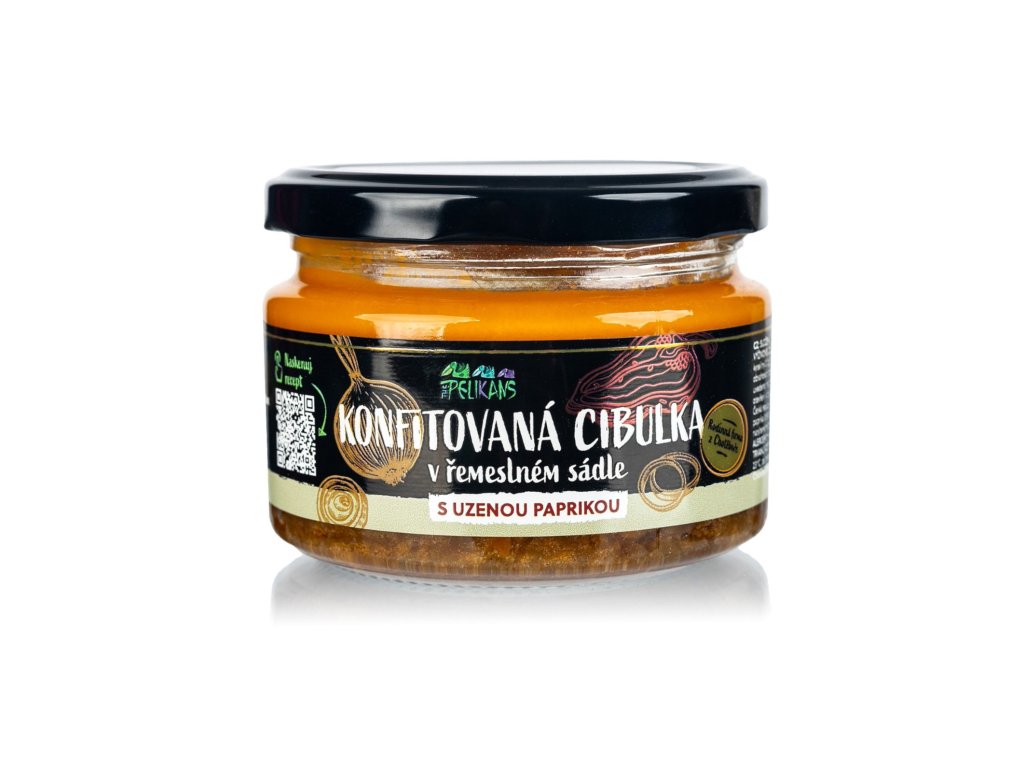 Poctivě konfitovaná cibulka v lahodném řemeslném sádle, tentokrát dochucená jemně kouřovou chutí uzené papriky. Spojení sladké cibule a výrazného aroma papriky vytváří delikatesu, která se hodí jak k tradiční české kuchyni, tak k moderním pokrmům. - Ručně vyráběno z prvotřídních surovin. - Bez konzervantů a umělých dochucovadel. Skladujte mimo přímé slunce při teplotě do 23 °C. Po otevření v chladu a spotřebujte do 5 dnů.Nutriční hodnoty