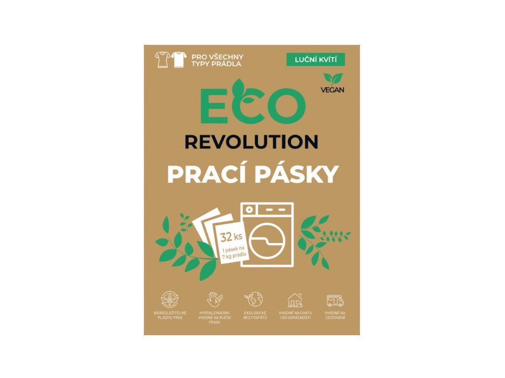 EcoRevolution VEGAN prací pásky jsou skvěle koncentrovaný prací prostředek bez vody, který je zcela bez alergenů, parabenů a fosfátů. Balení pracích pásků Vám nejen ušetří spousty místa v koupelně, ale oproti klasickým pracím gelům či práškům jsou lehké, skladné a snadno si je přibalíte třeba na dovolenou nebo na výlet. Díky používání pracích pásků snižujete ekologickou stopu až o 94% a to díky snadné přepravě. Klasických 32 pracích dávek o hmotnost cca 1,5kg jsme nahradili cca 50g koncentrovaného prostředku. Navíc nepotřebují žádný plast. Naše balení je totiž z plně recyklovatelného papíru. Díky svému eko složení jsou hypoalergenní a vhodné i pro praní oblečení těch nejmenších. Neobsahují fosfáty, parabeny, SLS ani 1,4-dioxan. A jaké jsou výhody pracích proužků? Skladné, lehké, bez zbytečných plastů Snadné praní bez odměrek a počítání objemu Vhodné na domácí praní, ale také na cestování či kempování Rozpustné již při 30°C, a to jak při ručním praní, tak v pračce Vhodné na všechny typy prádla - bílé, barevné i černé Účinné také na hloubkové čištění skvrn Bez přidaných parfémů a jiných látek Jak používat prací proužky od EcoRevolution? Odtrhněte pásek na klasickou 7kg pračku Pokud máte prádlo silně znečištěné, použijte pásky 2 Vhoďte prádlo do pračky Zapněte na jakýkoliv program s 30°C a výšeNutriční hodnoty