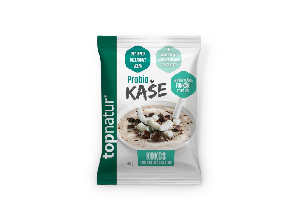 Probio kaše kokos s belgickou čokoládou svou nutričně vyváženou skladbou nezatěžuje organismus. Základem kaše je extrudovaná rýže a lyofilizované ovoce. Neobsahuje lepek. Probiotika obsažené v kaších jsou důležité pro správnou činnost trávicího ústrojí. Probio kaše jsou určeny pro sportovce, rekonvalescenty, pro osoby s intolerancí k laktóze, s bezlepkovou dietou, pro vegany, seniory a mohou je konzumovat i děti. Probio kaše jsou jedinečné přídavkem 6 probiotických kmenů v množství 5 miliard na porci. Dále obsahují inulin, prebiotickou vlákninu, která je velmi důležitá jako živný substrát pro růst probiotických kultur obsažených v kaši. Probio kaše obsahují také vitaminy a minerály – A, B1, B6, B12, C, D3, vápník, hořčík, fosfor, selen, železo, niacin a kyselinu panthothenovou. Snídaně s dobou přípravy pouze 3 minuty po zalití horkou vodou do 80 °C.Nutriční hodnoty