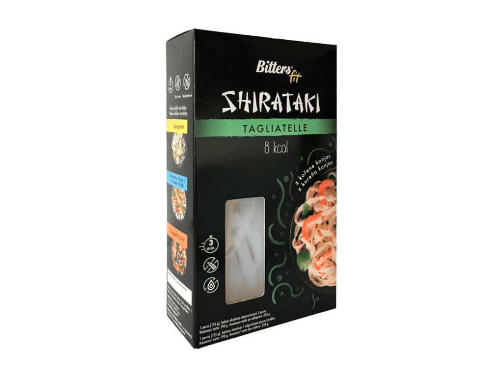 Shirataki ve tvaru tagliatelle nemají skoro vůbec žádné kalorie, neobsahuje tuky, cukry, bílkoviny ani lepek. Vláknina, která se vyskytuje ve výrobku, obsahuje stopové množství sacharidů v podobě glukomannanu, který je pro lidský organizmus téměř nestravitelný. Pouze nepatrné množství je tráveno v tenkém střevě a proto energetická hodnota těstovin shirataki je pouhých 8 kcal/100 g. Shirataki je namočeno v tekutině s charekteristickou vůni, která se zcela vytratí při oplachování tekoucí studenou vodou a není vůbec cítit v chystaném pokrmu. Shirataki FIT nemá žádnou chuť ani pach - vůni i aróma přejímá z omáčky, polévky nebo jiných složek pokrmu, se kterým jsou smíchány.Nutriční hodnoty