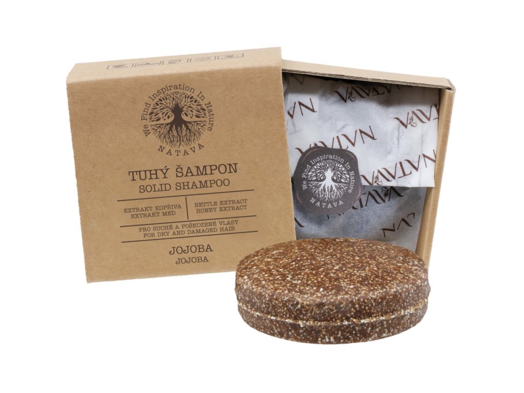 Tento přírodní tuhý šampon v praktickém ekologickém balení se dokonale postará o suché a poškozené vlasy. Originální receptura je obohacena o extrakty z kopřivy a medu, kakaové a shea máslo a olej z jojobových semen. Obsažené biologicky odbouratelné jemné tenzidy z kokosového oleje zbaví vlasy nečistot a nepříjemné mastnoty. Přírodní tuhý šampon vytvořený na míru brunetkám je zabalený s maximálním ohledem na přírodu a životní prostředí v recyklovatelném papírovém obalu. Ještě nemáte zkušenosti s tuhými šampony? Seznamte se s nimi do detailů! Tuhý šampon Jojoba obsahuje široké spektrum aktivních složek, mezi nimi výtažky z kopřivy dvoudomé a medu, které pečují o výživu vlasových folikulů, strukturu vlasů a pomáhají udržovat zdravou pokožku hlavy. Pokud chcete účinky šamponu ještě více podpořit, pak naneste na vlasy voňavý balzám. Vybírat můžete z bohaté nabídky, pokud však chcete dopřát svým vlasům opravdu intenzivní a maximální péči, pak vyberte balzám stejného typu. Péče jojobové řady zanechá vlasy lesklé, vvyživené a hladké. Tuhé šampony NATAVA Vám poskytují to nejlepší, co nabízí sama příroda. Vy se jí za to odměňujete tím, že jejich používáním neprodukujete žádné jednorázové plasty. Použití: Vybraný tuhý šampon stačí promnout v navlhčených rukou a nanést na mokré vlasy anebo rovnou vmasírovat do pokožky hlavy, jemně zakroužit ve vlasech, dostatečně zpěnit a pak už jenom opláchnout vodou optimální teploty. Po aplikaci šampon opláchněte od zbytků pěny a uložte na bezpečné místo. Ideálně na kovový rošt či elegantní mýdlenku. Šamponu můžete opatřit i praktický kovový obal, který se hodí zejména během cestování.Nutriční hodnoty