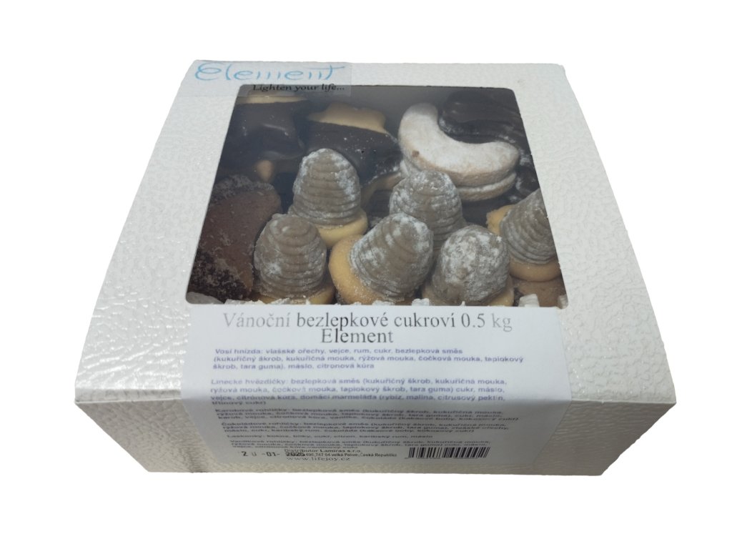 Linecké hvězdičky: bezlepková směs (kukuřičný škrob, kukuřičná mouka, rýžová mouka, čočková mouka, tapiokový škrob, tara guma) cukr, MÁSLO, VEJCE, citrónová kůra, domácí marmeláda (rybíz, malina, citrusový pektin, třtinový cukr)